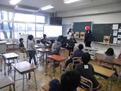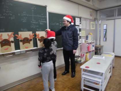 3年生の2時間目は、外国語活動でした。クリスマスが近いということもあり、ALTの先生はサンタクロースの帽子を被って授業をしてくださいました。今日は「Left」「Right」「Up」「Down」等方向を示す英語を使って、トナカイの福笑いをしました。ペアの友達の指示に従い、サンタクロースの帽子で目を隠した子供がトナカイの顔を完成させていました。