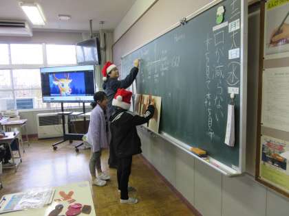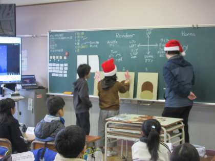 4年生の外国語の授業も、サンタ帽子で目隠しをしたトナカイ福笑いでした。「turn」という単語も使いながら、トナカイの角の角度を調節するなど、細かなところまでこだわっていました。