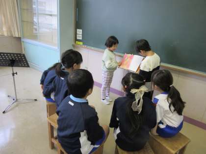 1年生はおすすめの本を読み聞かせで友達に紹介していました。どの子も友達のおすすめを興味津々で聴いています。