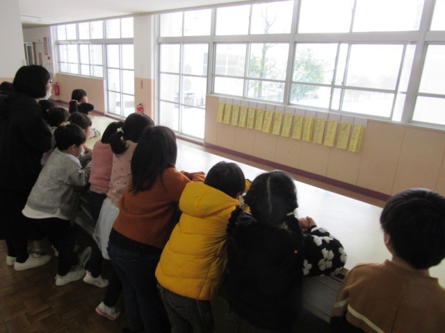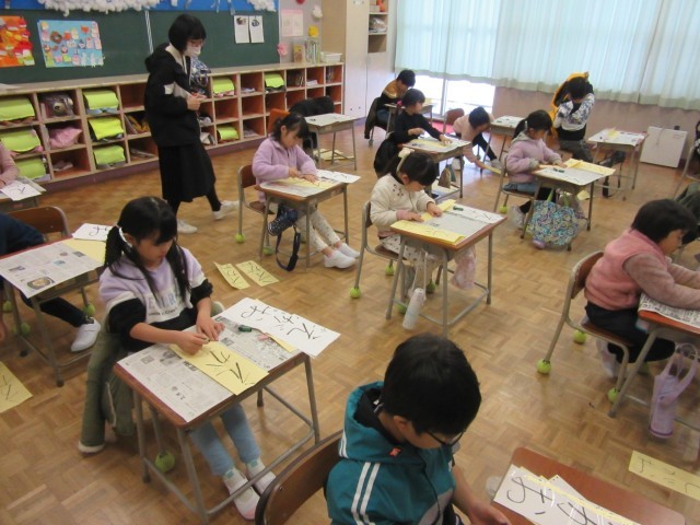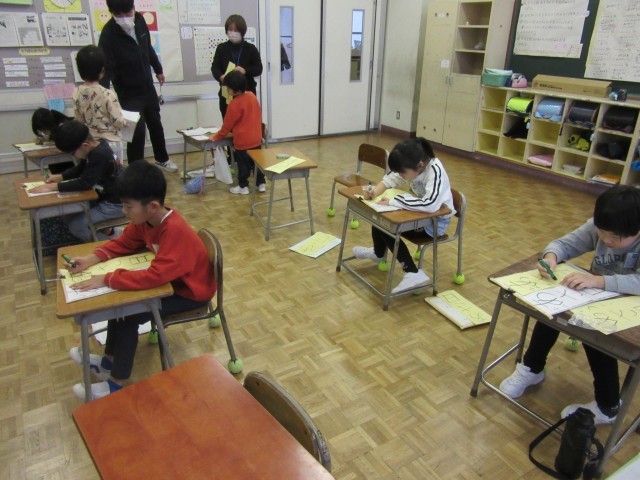 1,2年生は硬筆での書き初め大会です。手本をよく見て集中してがんばりました。