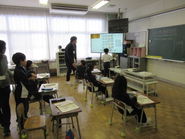 2年生は算数で10000までの数の学習をしていました。たくさんの数を分かりやすくする方法を、モニター画面を活用しながら紹介し合っていました。
