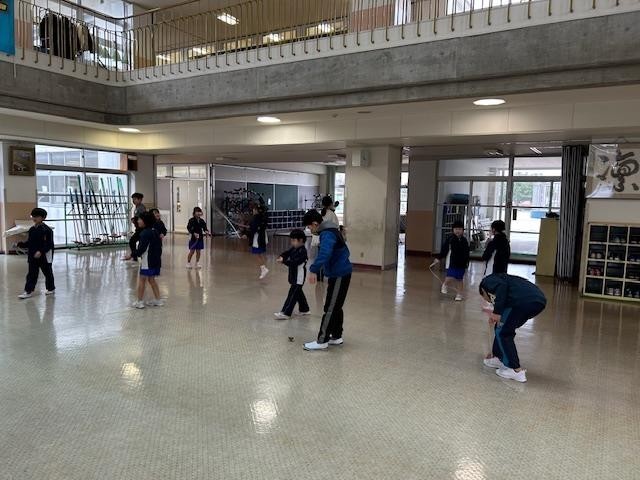 天気が悪く外で遊べなかったため、コモンスペースにいろいろな学年の子供たちが集まって一緒にこまをしたり縄跳びをしたりしていました。異学年の子供たちとも仲良く遊べるのが四方っ子のすてきなところです。