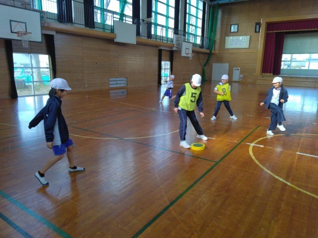 3年生の3時間目は、体育の学習でした。ゲーム領域のゴール型の学習で、サッカーの動きやルールを易しくした「スライドサッカー」に挑戦しています。今日は、パス練習をした後、3対2をしました。自分と味方の間に守備を入れないようにするには、どこに動けばよいかを考えました。全員が常に動いてスライドサッカーを楽しんでいました。