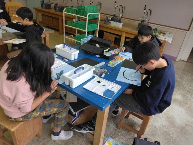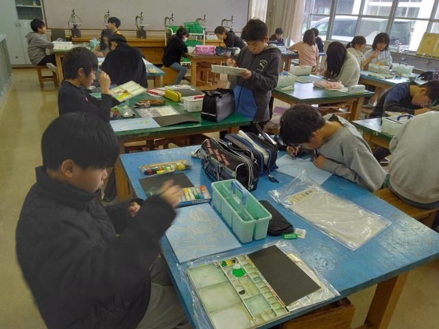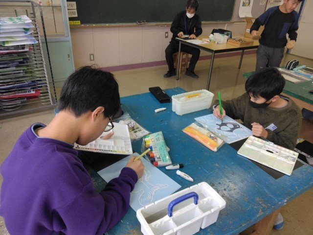 5年生の5・6時間目は、図工の学習でした。彫刻刀で彫った版に色を付け、黒い画用紙に印刷し始めました。水の量を調整しながら絵の具の濃さを確かめてました。仕上がりが楽しみです。