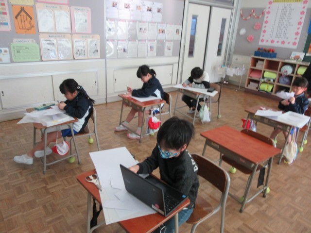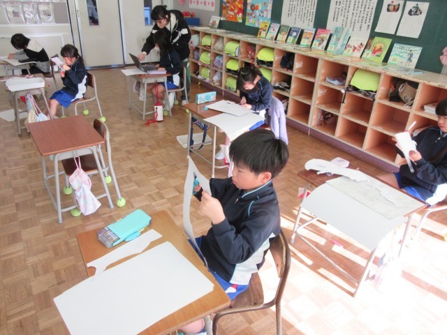 1年生は図画工作科で版画製作をしています。ファミリーパークで見た動物を紙で切り取って版画にする紙版画に取り組んでいます。かわいい動物、かっこいい動物いろいろな動物の版ができあがりそうです。