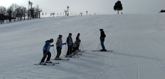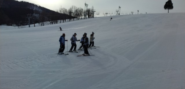 階段登行で斜面を登り、プルークボーゲンをしている2班です。
