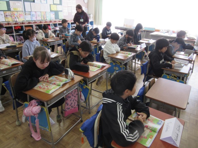 4年生はALTと外国語活動の学習をしていました。学校の中の様々な教室の名前を英語で練習していました。イラストをもとに、何の教室か想像しながらそれぞれの教室を英語で発音していました。グラウンドを英語では「play ground(プレイグラウンド)」ということを知り、「なぜplayがつくの?」と日本語と英語の違いを質問していました。