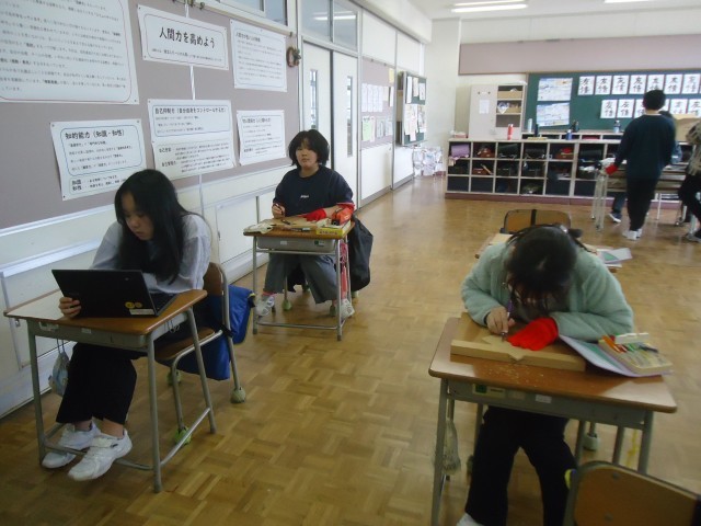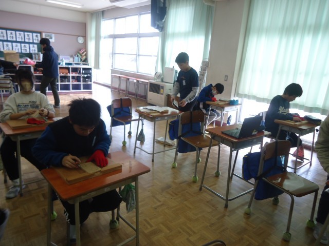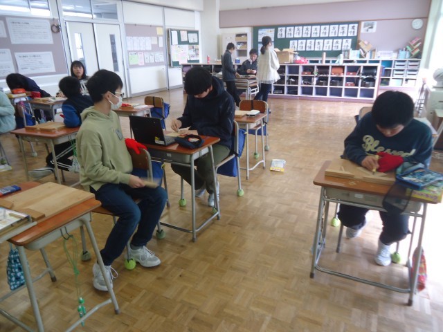 6年生の3時間目は、図工の学習でした。卒業製作として、木材を使ったミニラックをつくっています。今日は、木板に大切にしたい思い(言葉)を彫刻刀を使って刻んでいました。「絆」「全力」等、選んだ理由を聞くと、しっかりと答えてくれる6年生。完成が楽しみです。