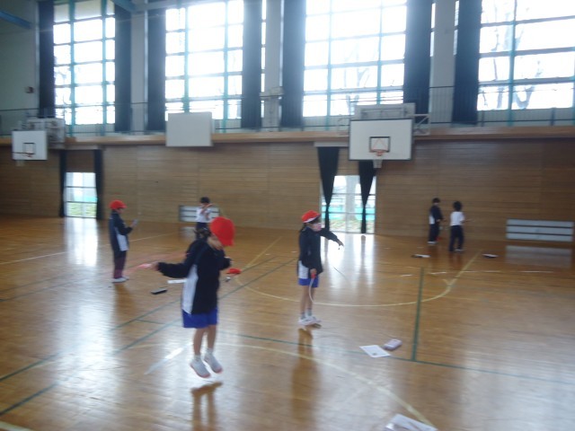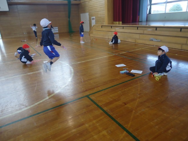 1・2年生の3時間目は、体育の学習でした。今日もペアの友達と短なわとびのレベルアップに向けてがんばっていました。練習するたびに跳ぶ回数が増えたり、できる技ができたりするなど、友達と楽しみながら練習する子供たちです。