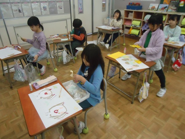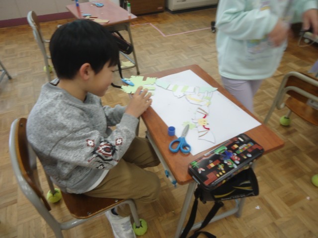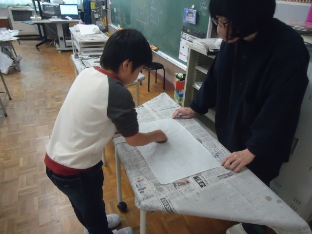 1年生の4時間目は、図工の学習でした。紙や毛糸等を用いて版をつくったり、黒色のインクを付けて印刷したりしました。材料の特性が出ていて、とても素敵な作品になりました。