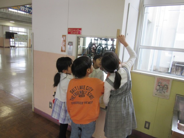 2年生は算数科で長さの学習をしています。「mm」「cm」「m」の単位を使って、大きなものの長さを友達と協力して測っていました。1mものさし1本だけで測ることができないものをどうやって測ったらいいのか、考えを出し合いながら活動を進めていました。