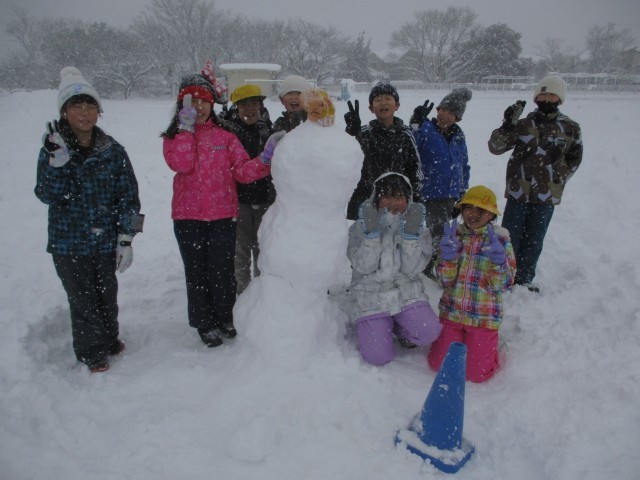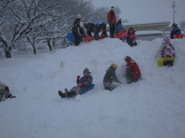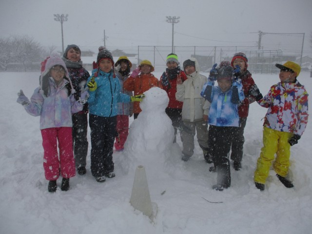 今日の体育は雪遊びをしました。グループで協力して、大きな雪だるまを作りました。その後、ソリで滑ったり大きなお風呂を作ったりして、仲良く遊びました。