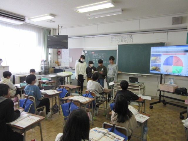 5年生は外国語活動で、都道府県の紹介を英語でしていました。行きたい都道府県でしたいことを「I want to~」の英文を使って、食べたいもの、いきたいところ、見たいもの等を紹介していました。友達の発表を聴きながら、特産物や観光名所を知ることができ「そうなんだ」というつぶやきも聞かれました。