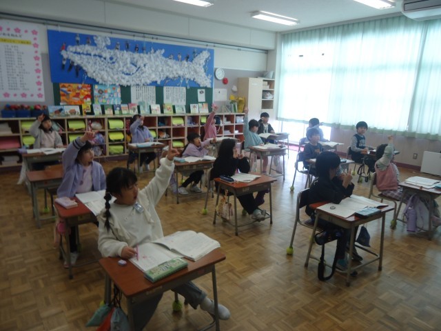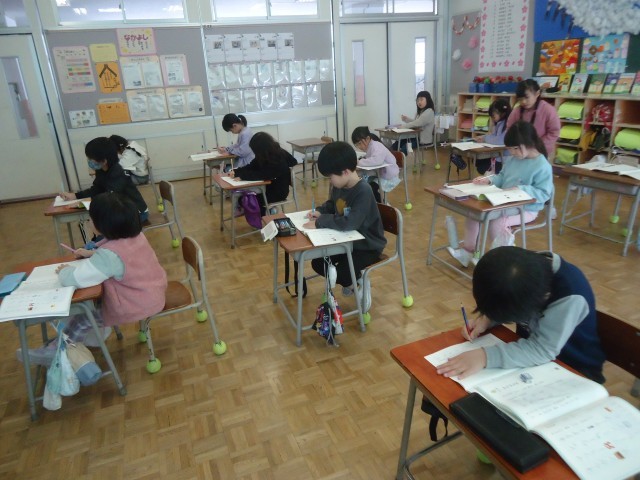 1年生の5時間目は、国語の学習でした。書き順や形を間違いやすいカタカナを確認していました。特に「ヒ」の書き順、「シ」「ツ」の形に悩む子供がいました。一字一字丁寧にノートにカタカナを書いていました。