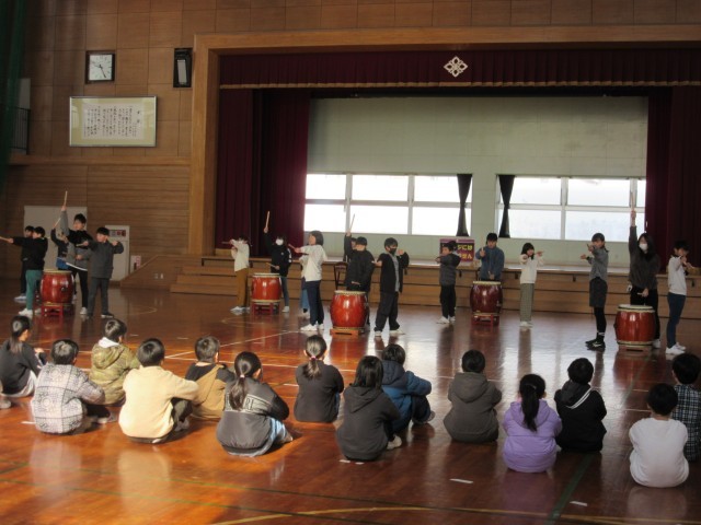 5年生の迫力ある演奏を見た後に、4年生が5年生に教えてもらいながらかけ声や、待つ姿勢、ポーズの練習をしました。場所移動をしながらの演奏は大変そうでしたが、4年生の子供たちは、5年生のようにかっこよく演奏したいという目標に向かってがんばっていました。