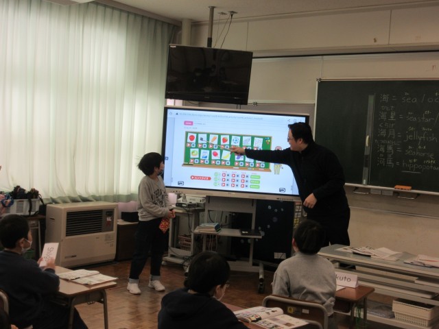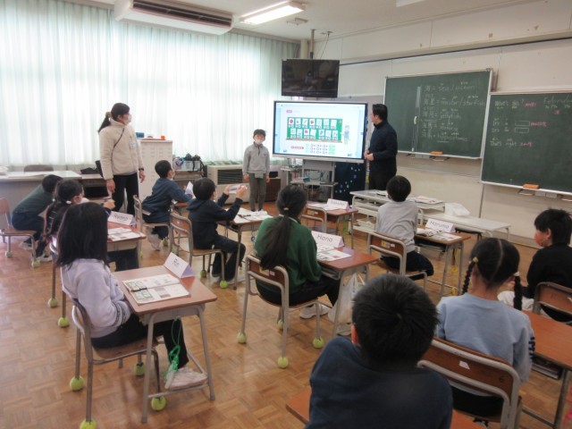 3年生は外国語活動で3ヒントクイズをしていました。色、大きさ、形等のヒントを英語で伝え、イラストの中から答えを探します。質問の仕方も、ヒントの出し方も上手な3年生でした。