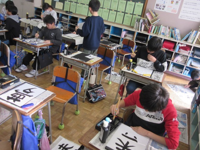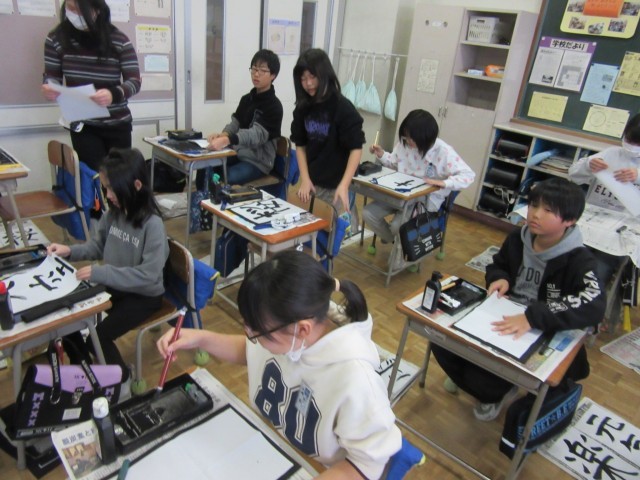 5年生は書写の学習で、卒業を祝う掲示に使う作品を書いていました。「未来」「桜」等、真心を込めて一文字一文字丁寧に書いていました。