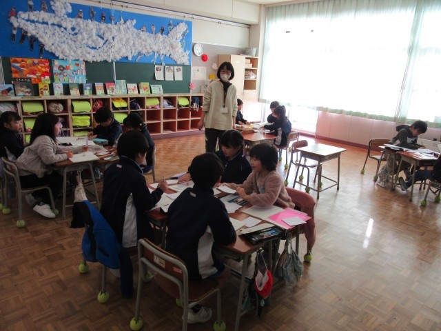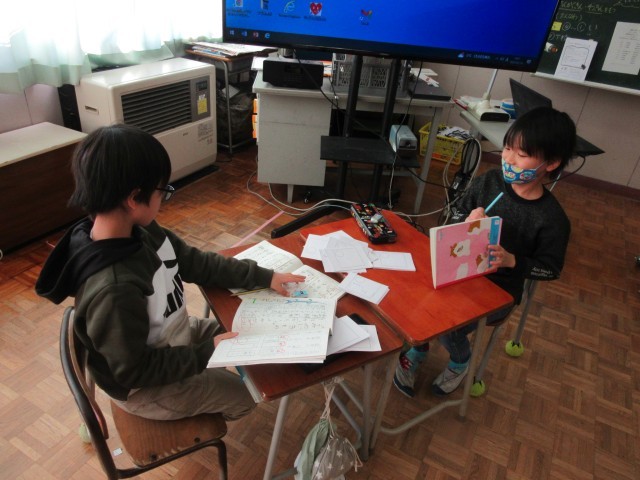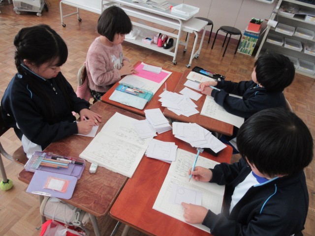 1年生は国語科でかるたづくりをしていました。「『あいす』の中に『いす』がある」のような言葉遊びを集めたかるたです。ノートを見返したり、友達に聞いたりしながらたくさんのかるたをつくっていました。読み札は「あ」(あいす)から始まるのに取り札は「い」(いす)になっているので、なかなか取るのが難しそうです。また、アイスの中に椅子がある絵を描くなど、言葉に合わせた楽しいかるたになっていました。