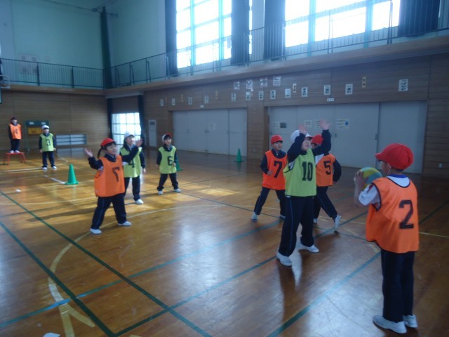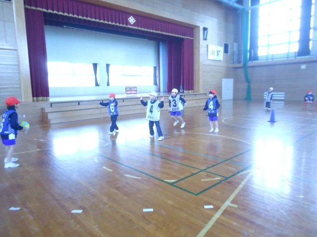 1・2年生の3時間目は、体育の学習でした。昨日から始まった「パスポートボール」ですが、今日は守備を入れてゲームをしました。ハーフコートごとに守備できる人数が決まっています。守備がいると、なかなかパスをつなぐことができなかったのですが、守備がいない場所に動いたり、「こっちにパス」等声を出したりしながら、ゴールに向かって走っていました。