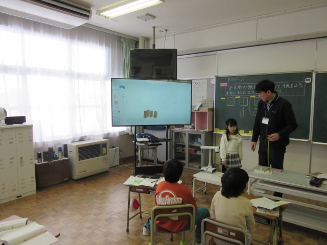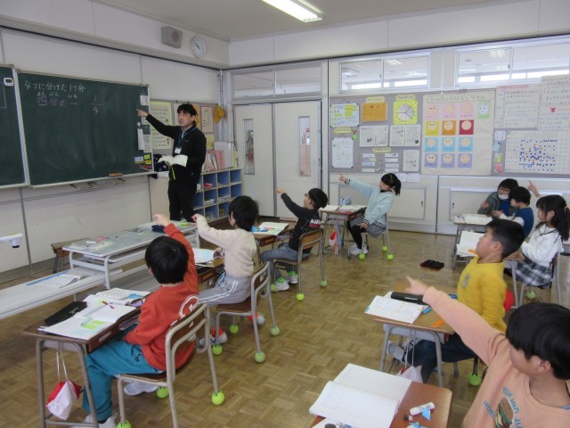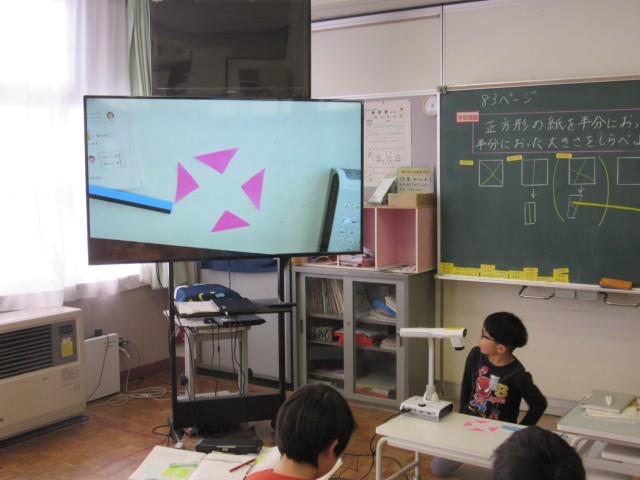 2年生は折り紙を半分に折ってできる形を使って「○分の一」という分数の学習をしていました。1回折って「二分の一」、2回折って「四分の一」となることを実際に折り紙を使って学びました。半分の折り方によっていろいろな形ができるけれど、どれも「四分の一」であることも確認していました。
