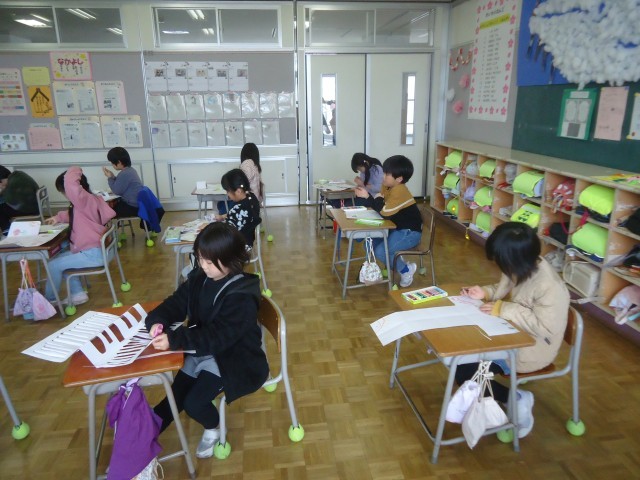 1年生の5時間目は、図工の学習でした。大きな画用紙を切ったり折ったりして、扉や部屋をつくり、そこを開けると、自分が思い描く世界が表れます。子供たちは、植物や食べ物、ゲームのアイテム等、考えながら描いています。中には、物語にしている子供もいました。完成が楽しみです。