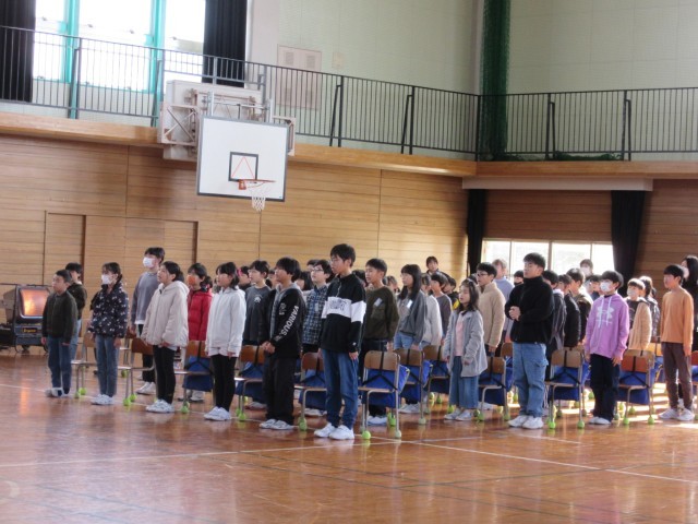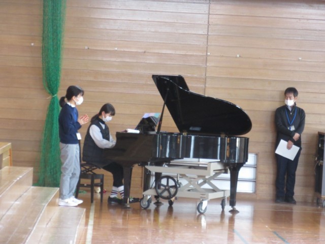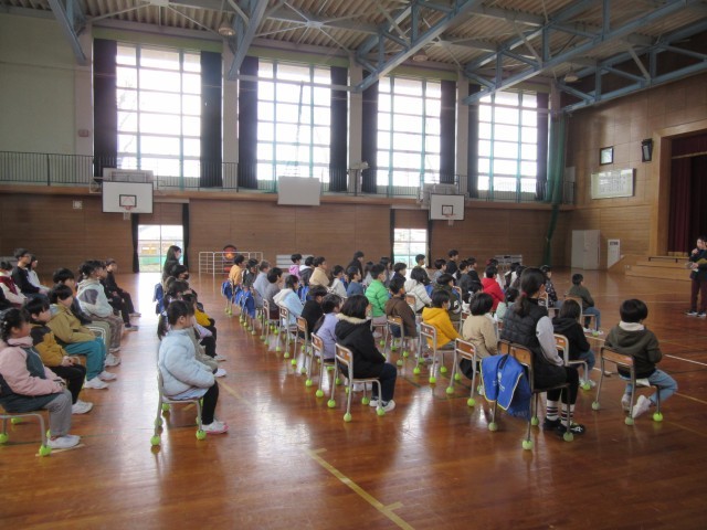 体育館で在校生の卒業式練習を行いました。お世話になった6年生さんのために、素晴らしい式にしようと、緊張感をもって立派な態度で練習に取り組みました。卒業式で在校生が歌う歌の練習もしました。初めてピアノ伴奏に合わせて歌ったのですが、2つのパートの声が響き合うすてきな合唱になりました。
