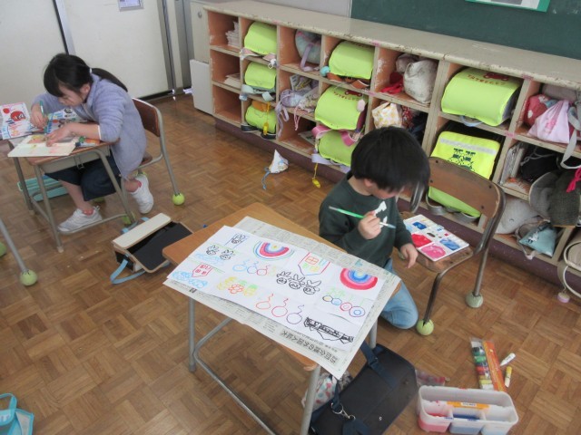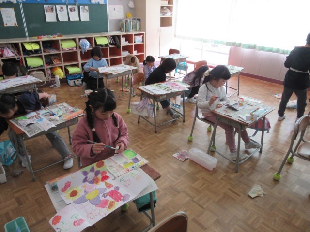 1年生は図画工作科で、扉を開くことで絵が変わる作品をつくっています。水彩道具を使って色を付けることで、より自分が表現したかった景色が扉を開くことで広がりました。