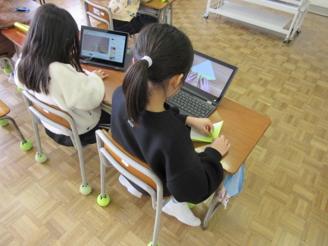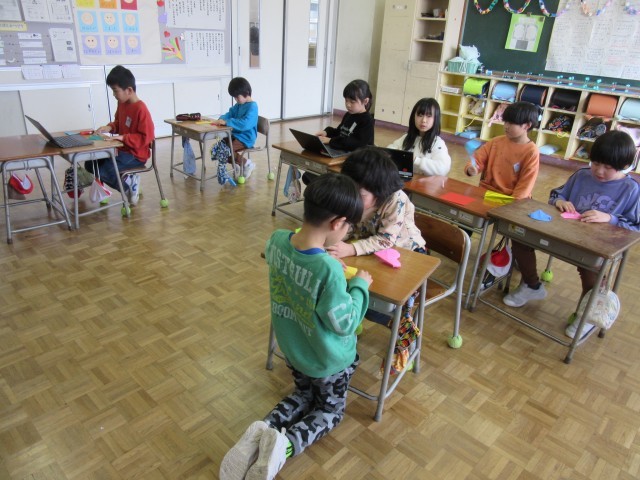 2年生はお世話になった先生にプレゼントする折り紙作品をつくっていました。「何色がいいかな」「かわいいものあげたいな」等、子供たちなりに渡す先生のことを考えてつくっていました。パソコンを見ながら初めてつくる折り紙作品に挑戦している子供もいます。