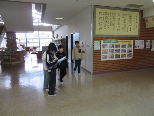 4年生は四方小学校の校内のどこに、どれくらい消火器や消火栓があるのかを調べていました。地図を持ち「ここにもあった」「結構あるね」等話しながら、グループで活動していました。
