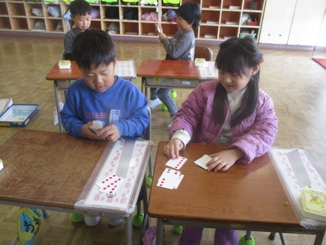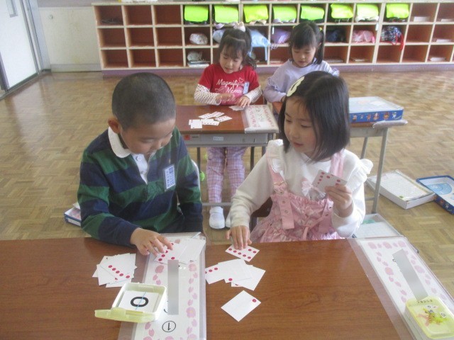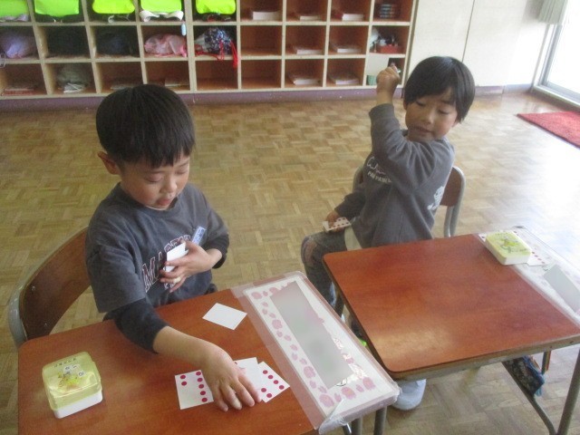 今日は、赤玉カードや数カードを使って、友達と数の大きさ比べをしました。