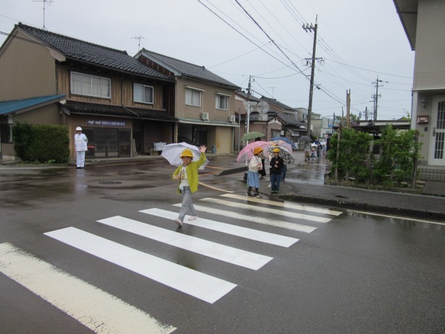 交番の方に交差点で気を付けることについて話を聞いた後、実際に歩きました。生憎の雨でしたが、カッパを着ながら、傘を差しながら周りを見づらい状況での周囲確認もしっかり練習できました。