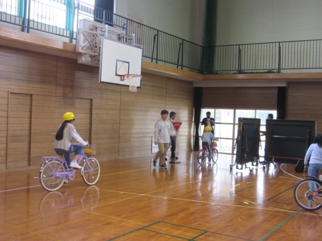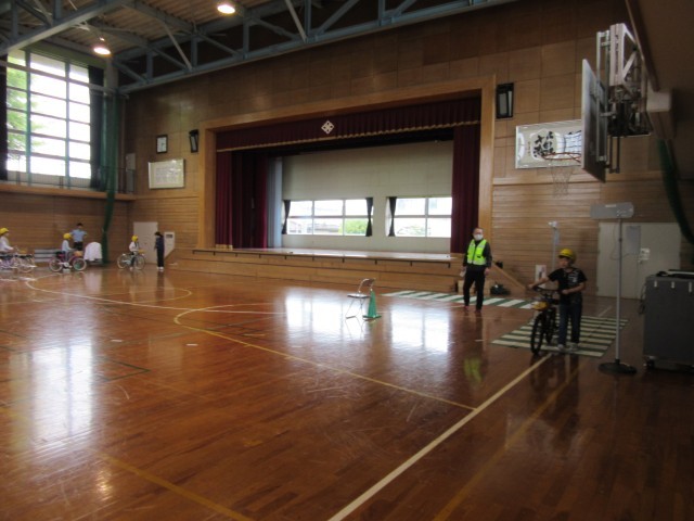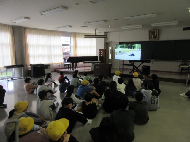 3~6年生は、体育館で自転車の乗り方について学びました。信号や踏切、交差点をどのように通ればよいか、しっかり確認しながらコースを進んでいました。DVDで自転車運転で起こりうる危険な場面についても学ぶことができました。連休中も安全に自転車に乗ってもらいたいです。