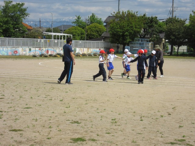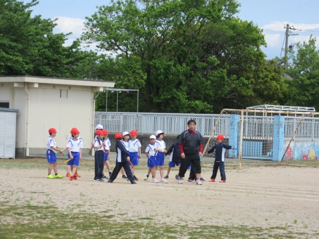 5月7日(水)3、4年生 今日の授業風景(バトンパスの練習)