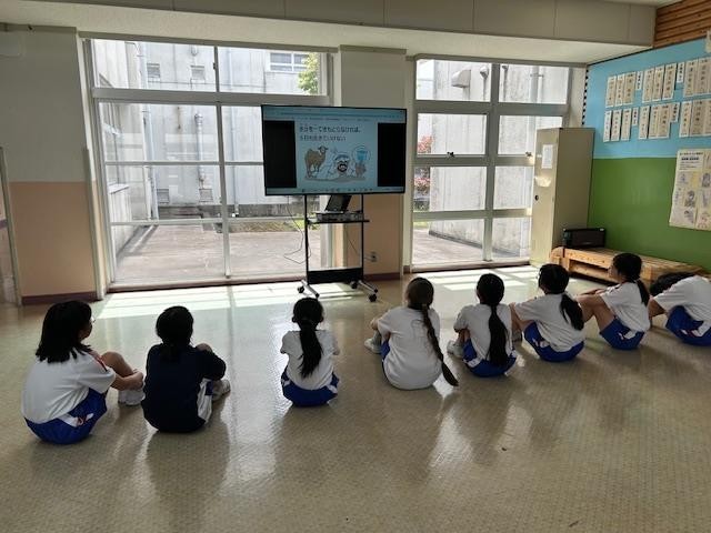 2、3、5年生の内科検診を行いました。検診の注意事項やクイズを見ながら、静かに順番を待っています。