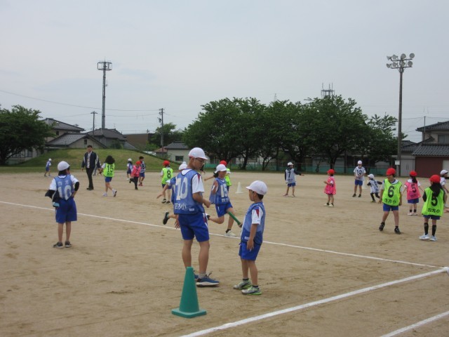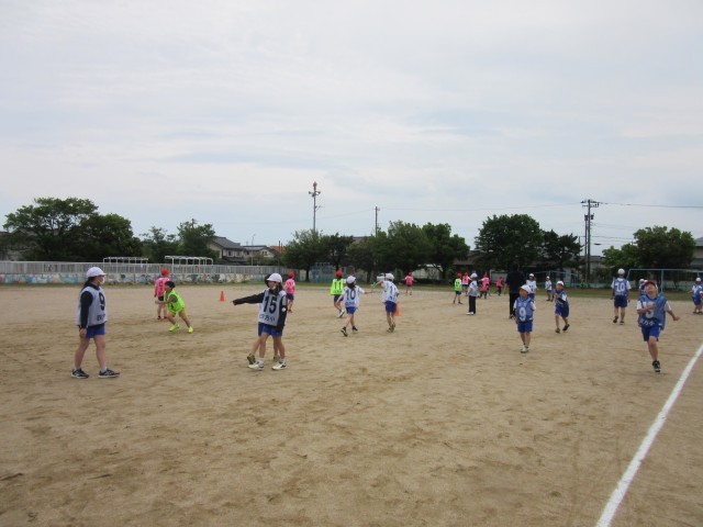 全校でリレーの練習をしました。今日は、いくつかのグループに分かれてバトンパスの練習です。6年生が体や手の向き、渡し方等を丁寧に教えながら練習を進めていました。