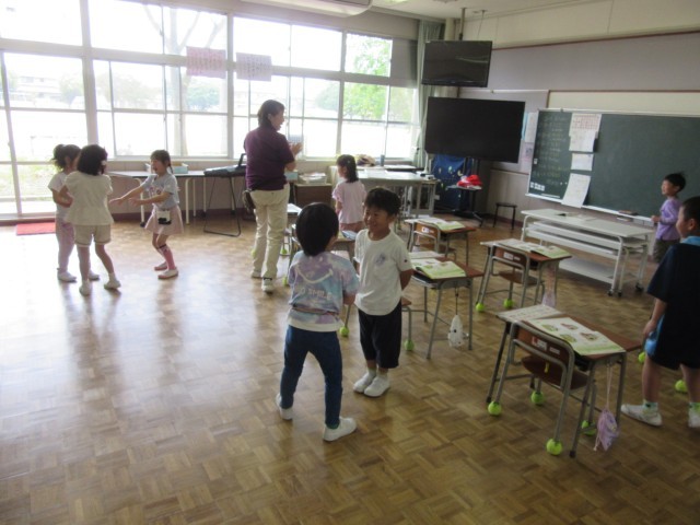 1年生は道徳科で気持ちのよい挨拶について考えていました。「おはよう」の後にもう一言あるとうれしいということで、実際に友達と練習をしていました。「おはよう、今日休み時間一緒にフラフープしようね」「おはよう、運動会がんばってね」等、声をかけ合うことでみんなにこにこ笑顔になっていました。