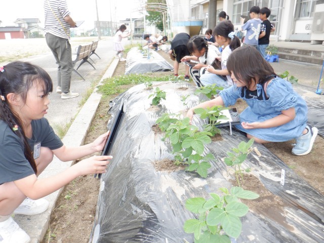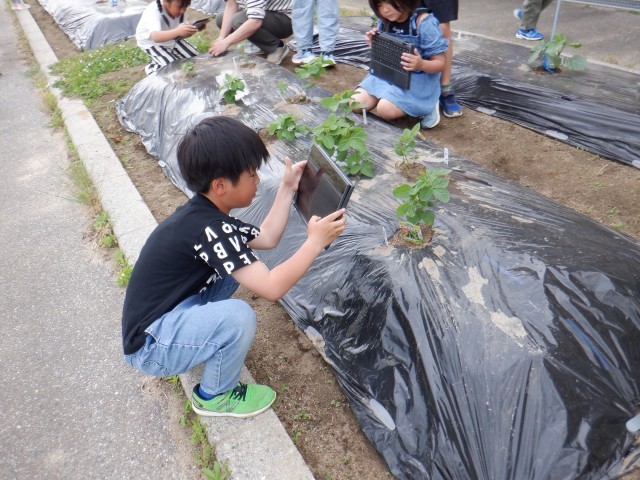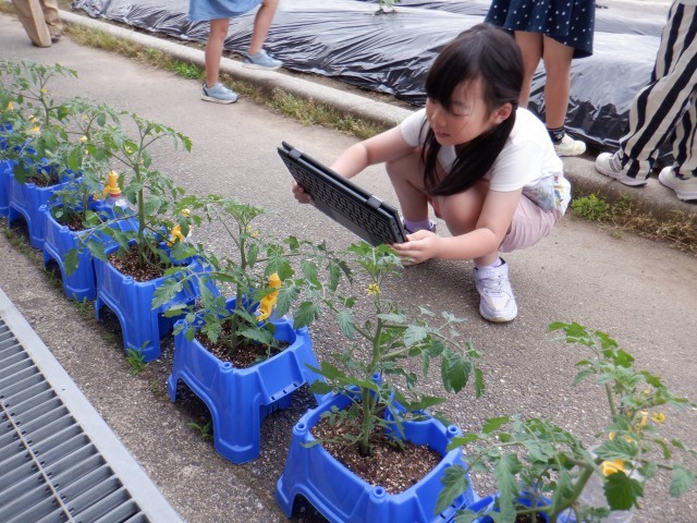 今日は植えてから10日ほどたった野菜を観察しました。花が咲いていたり、葉にありがむらがっていたりと少し変化が見られました。子供たちは自分の野菜を観察し、どんなお世話が必要なのか、どのように調べたらよいのかなど次のことを考えていました。