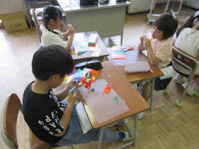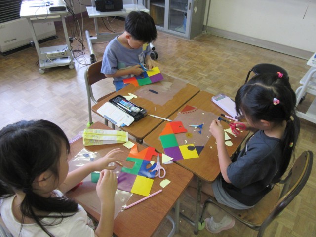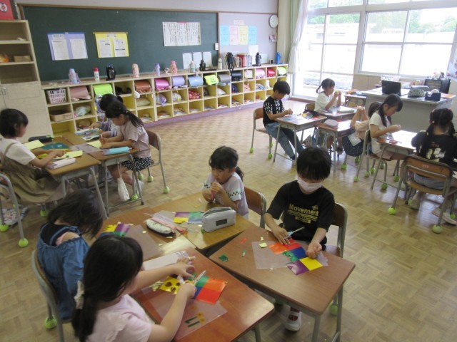 2年生は図画工作科で「光のプレゼント」という作品づくりに取り組んでいます。透明なカラーシールをシートに貼って窓際に飾ると、光を通してきれいな作品になります。出来上がりを想像しながら思い思いのデザインで作品をつくっていました。
