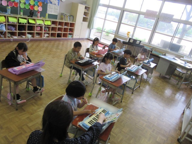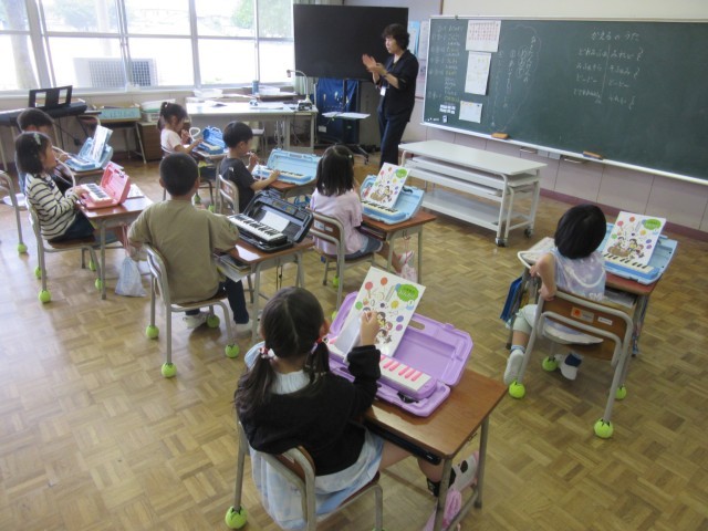 1年生は音楽科で鍵盤ハーモニカの練習をしています。「かえるのがっしょう」の曲に挑戦しています。細かいリズムのところが難しそうでしたが、息つぎの場所を確認しながらがんばっています。