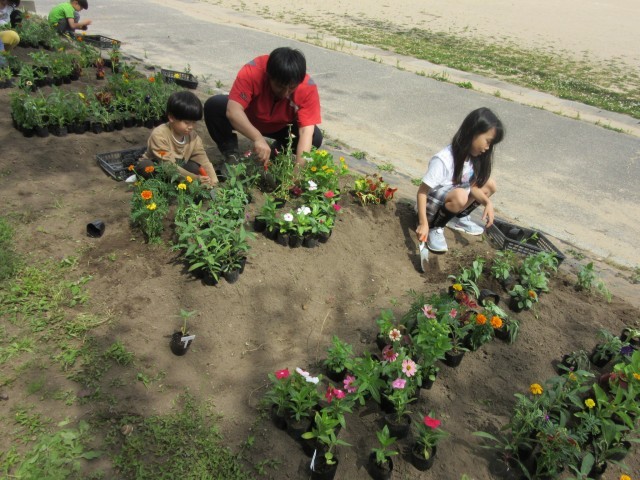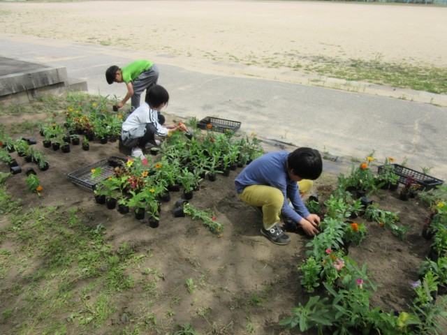 3年生は花壇に花の苗を植えました。一人ずつ場所を決めて、花の苗を並べて植えました。囲むように植えたり、文字になるように植えたりと楽しみながら活動していました。