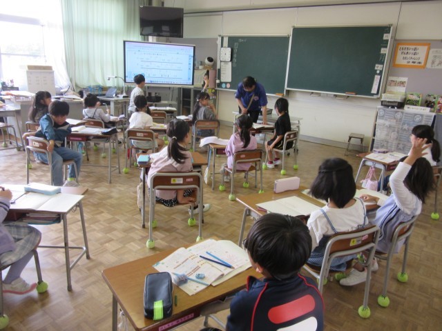 2年生は算数科の学習をしていました。大型モニターを使って、大きな数の数直線の確認をしています。学習の内容に合わせて机の向きや位置を変えたりしながら、学習しやすい形で学習しています。