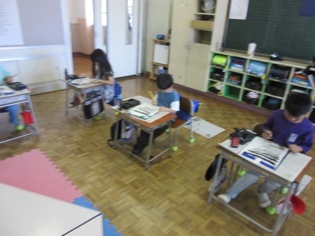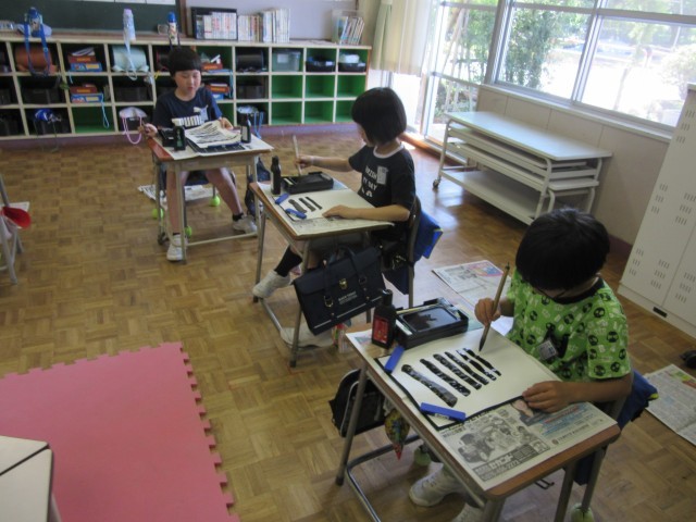 筆を使って太い線、細い線、渦巻き線等色々な線を書くことができました。準備、片付けも上手にできました。これからの学習も楽しみな様子の子供たちです。