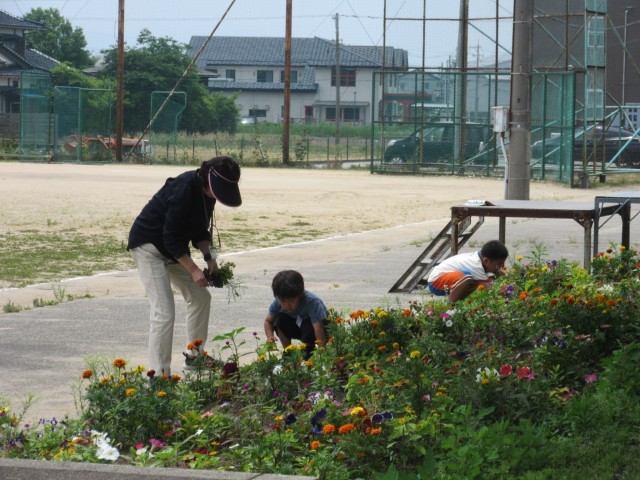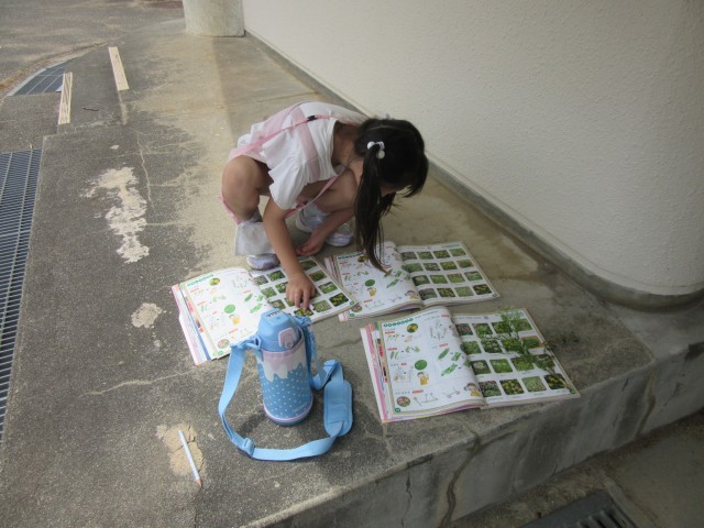 1年生は生活科で様々な草花を探していました。教科書に載っている草花を見付けては名前を確認していました。教科書に載っていない草花も見付け、先生に教えていました。