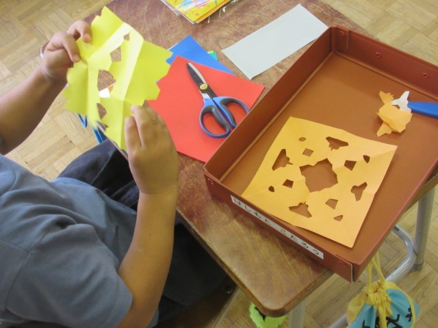 1年生は図画工作科ではさみでちょきちょき切ってできる飾りづくりを楽しんでいます。色紙の折り方や、切るところを変えることで様々な模様の飾りができます。開いてみるまでどんな模様になるか分からないところもおもしろさの一つです。