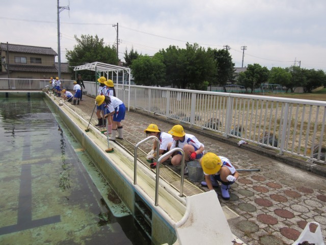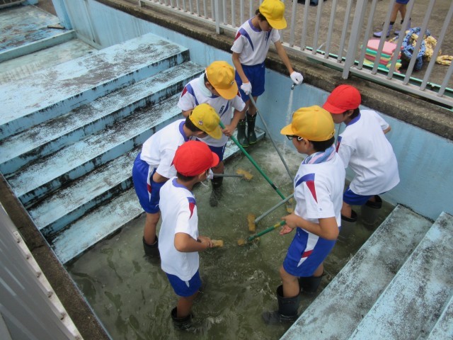 5年生はプールサイドの溝や目皿、シャワー付近の掃除をしました。ブラシやたわしを使って、きれいに磨いてくれました。