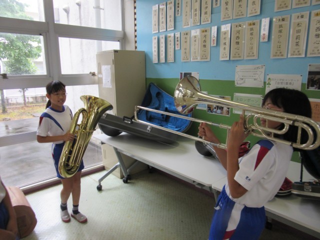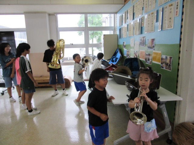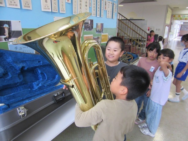 17日の学校コンサートで紹介された楽器を、近隣の小中学校から借り、実際に子供たちが触れることができるような展示コーナーをつくりました。早速興味をもって実際に楽器を持って重さを体感したり、演奏のまねをしてみたりと、より楽器に親しんでいました。