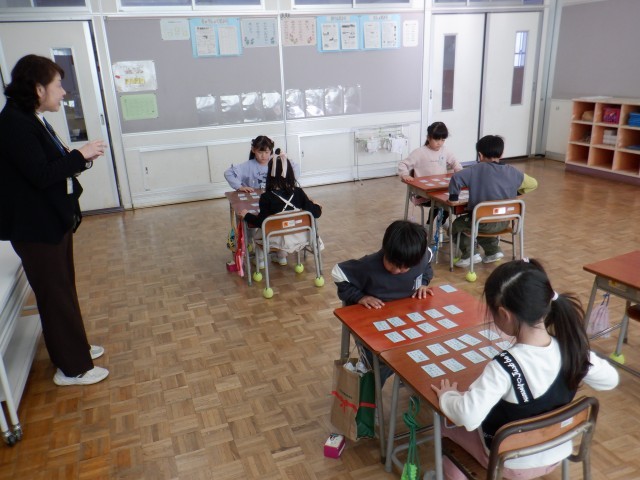 1年生は生活科で見つけた秋を使っておもちゃをつくり、「あきまつり」をする計画を立てています。今日は実際に友達のつくったおもちゃで遊んでみました。実際にやってみて「~したらいいと思う」等より楽しく遊べる提案をお互いにしていました