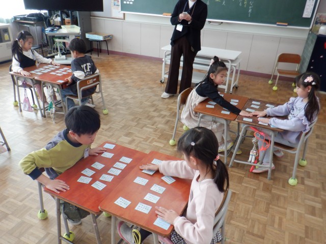 国語の時間に、百人一首に挑戦しました。「いざ」「勝負!」の掛け声でピンと緊張感が生まれます。上の句の後の下の句を聞き漏らすまいと、子供たちはぐっと集中していました。「〇枚とったよ」「またやりたい」と盛り上がった1年生でした。