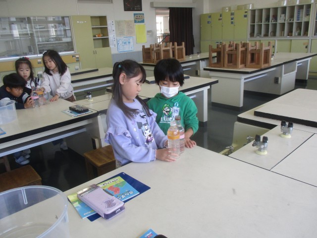 1年生は算数科でペットボトルに入る水のかさを比べる活動をしていました。これまで直接移し替えてかさを比べたり、同じ大きな入れ物に移し替えて比べたりしてきました。今日は、小さなカップをいくつも使って、何杯になるかを調べて比べています。どうやったら、3つのペットボトル全部比べられるのか、みんなで考えていました。