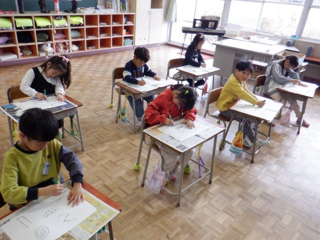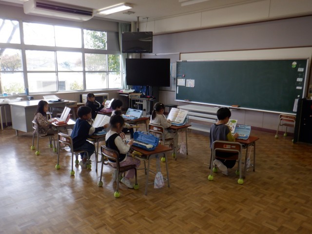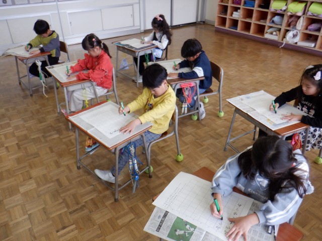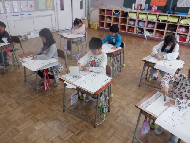 1年生は書写の時間に書初めの練習をしています。丸みのあるひらがなを意識して繰り返し練習しました。2回目の練習で少しずつ硬筆墨で書くことも慣れてきたようです。